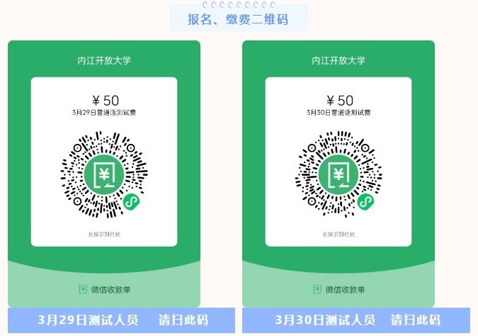 为满足广大考生测试需求,内江市普通话水平测试站拟定于2025年3月举办为期两天的普通话水平测试工作,现将有关事项通告如下: 一、测试安排 1.测试时间:3月29日、3月30日(具体测试时间以准考证为准) 2.测试地点:世界杯下单官方网站 考试当天考生按照准考证上测试时间,携带好身份证原件,提前半小时到世界杯下单官方网站603多功能教室候考。 二、报名时间 3月1日上午9:00起至3月10日上午9:00止。(本次报名限额700人,3月29日350人,3月30日350人,以缴费确认为准,额满截止) 三、报名方式 请考生自行选择测试日期,并长按识别其二维码报名、填表、缴费(所填信息必须准确无误,否则影响后续测试)。