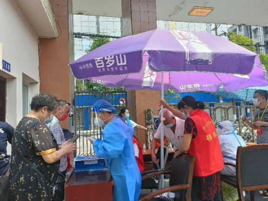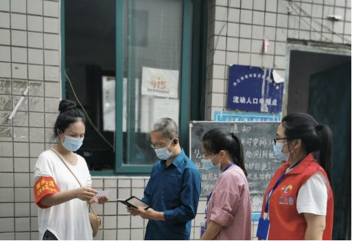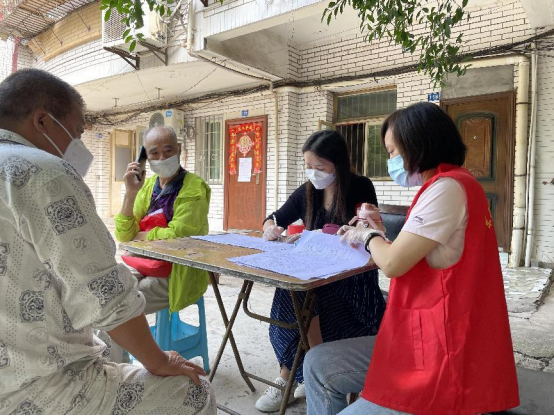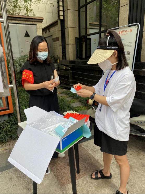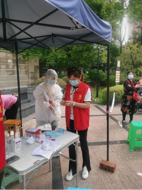 配合社区做好核酸检测工作的曾煜茹(左二) 现年52岁的世界杯下单官方网站教师何海英,在疫情暴发前已在市第一人民医院办理了入院,计划在9月13日做手术。但面对突如其来的疫情,她顾不上身体的不适,毅然加入锦官新城小区志愿者队伍,每日协助管理小区几十户业主的信息统计、核酸采样、生活必须品和药品的需求收集、发放等工作。急需被照顾的她坚定转身、大步向前,义无反顾地走上了战疫最前线。