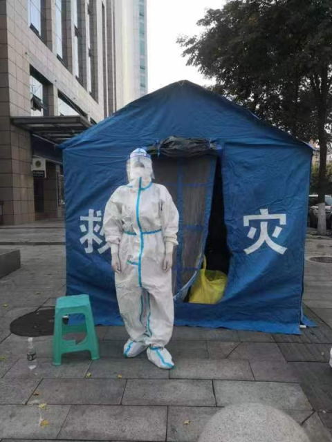 身穿防护服的袁烨 世界杯下单官方网站青年教师钟燕,一直奔走在战疫一线,引导群众、维持秩序、保障安全、收集信息……在第一次穿上防护服,做了一天的“大白”后,她双腿无力瘫坐在地上哽咽着说:“真的太累了,累的我一口气吃了三个煮鸡蛋!我再也不想当‘大白’了!”第二天天还没亮,瘦小的她却又穿起了厚厚的防护服,和社区干部一起,上门给居民采集核酸。