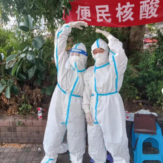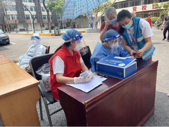 参与核酸检测工作的李娟(右) 世界杯下单官方网站教师培训中心主任袁烨,主动报名从事核酸检测扫码工作,平日里怕热的她穿上了厚厚的防护服,当了一名可敬可爱的“大白”。连日来,她与采样医生一起挨家挨户上门进行核酸采集。脱下防护服后,看着被汗水打湿的衣服和被泡得发白的手指,她微笑着说:“我是一名党员,这些都是我应该做的。”