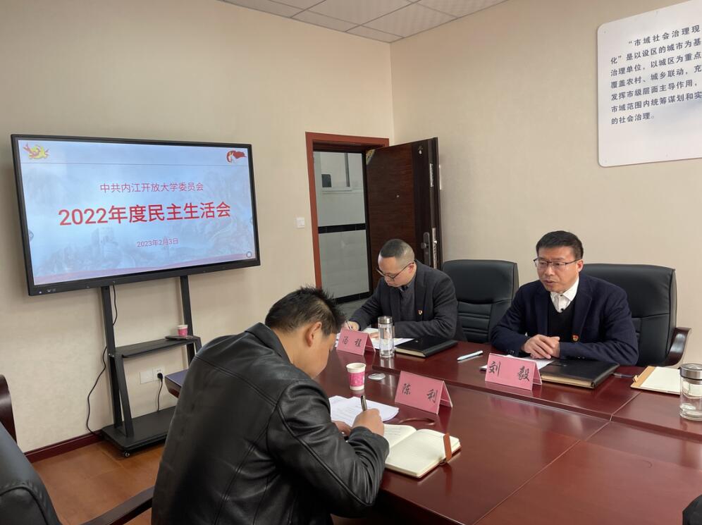 近日,世界杯下单官方网站召开党委班子2022年度民主生活会。内江市纪委监委驻市教育局纪检监察组、内江市教育局派员到会指导。会议由内江开大党委书记、校长刘毅主持。 图1:会议现场 会前,学校领导班子进行了认真准备。在全面学习领会党的二十大精神、党章和习近平总书记在党的二十届一中全会上的重要讲话精神的基础上,于2月1日集中开展了专题学习讨论;同时严格落实“四必谈”要求,认真开展谈心谈话,倾听民意;广泛征求意见建议,共收集班子建议7条,班子成员建议20条,为开好民主生活会奠定了良好基础。 会上,刘毅通报了2021年度民主生活会检视剖析问题整改落实情况和领导班子及班子成员征求意见建议情况,代表领导班子紧扣“六个带头”深入查摆问题,深刻剖析原因,明确了整改措施和努力方向,并带头作个人对照检查,主动接受其他班子成员批评。随后班子成员逐个开展对照检查,并进行相互批评,相互批评开门见山、坦诚相见、推心置腹、交流充分,践行了加强和规范党内政治生活新要求,起到了统一思想、凝聚力量、促进团结、加油鼓劲的作用。