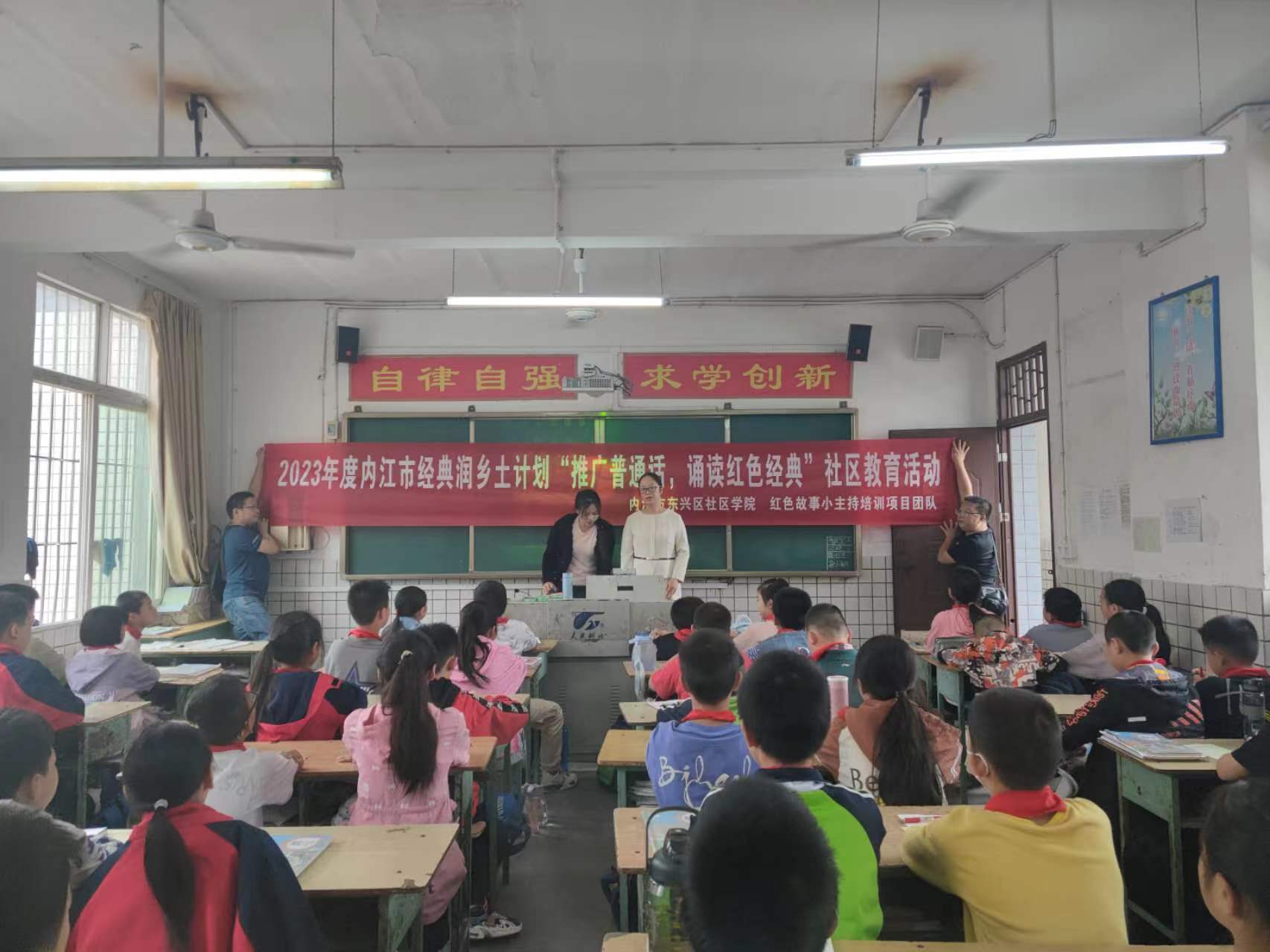 近日,东兴区社区学院携手东兴区顺河小学,开展“内江市经典润乡土计划——推广普通话,诵读红色经典”活动。 在乡镇学校教师和学生诗歌朗诵表演中,指导老师周俊和梁庆分别领读经典诗歌作品《读中国》。活动现场,师生们一边跟读,一边纠正自己的“本土普通话”。