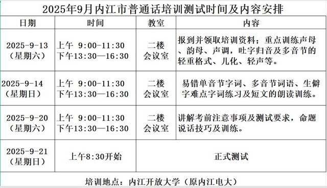 请参加内江市2025年9月普通话培训的考生于9月13日上午8:30到世界杯下单官方网站二楼会议室报到并领取考试复习资料。